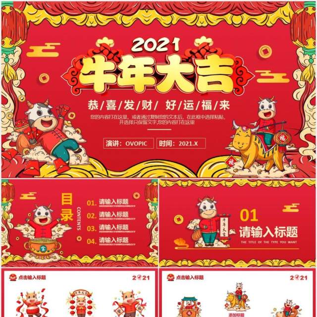 OVO图库提供2021红色喜庆牛年大吉扭转乾坤新年企业年会庆祝PPT模板供会员免费下载,作品格式为ppt。更多精彩节日庆典PPT素材,尽在OVO图库。