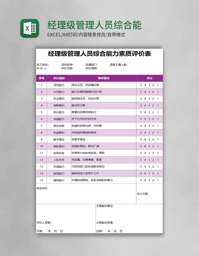 OVO图库提供经理级管理人员综合能力素质评价表excel表格供会员免费下载,作品格式为xlsx。更多精彩人事管理素材,尽在OVO图库。
